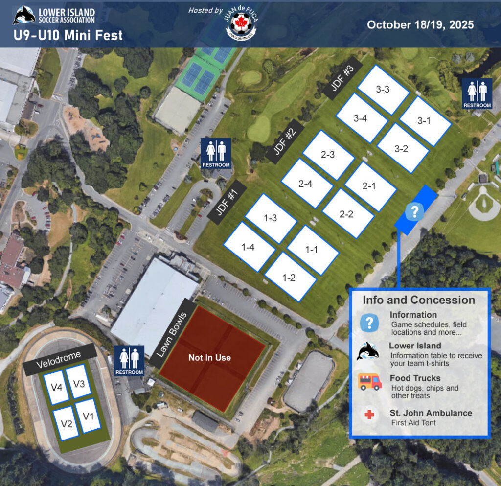 Your games will be played at the Juan de Fuca Recreation Centre Fields, 1767 Island Hwy, in Colwood. Juan de Fuca Field #1, #2, and #3 are natural grass and the Velodrome, located behind the “Q Centre” arena is artificial turf. The Field map and layout can also be found attached.